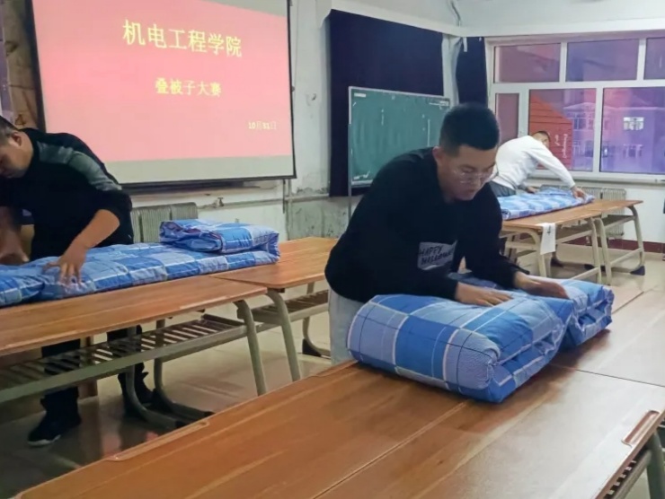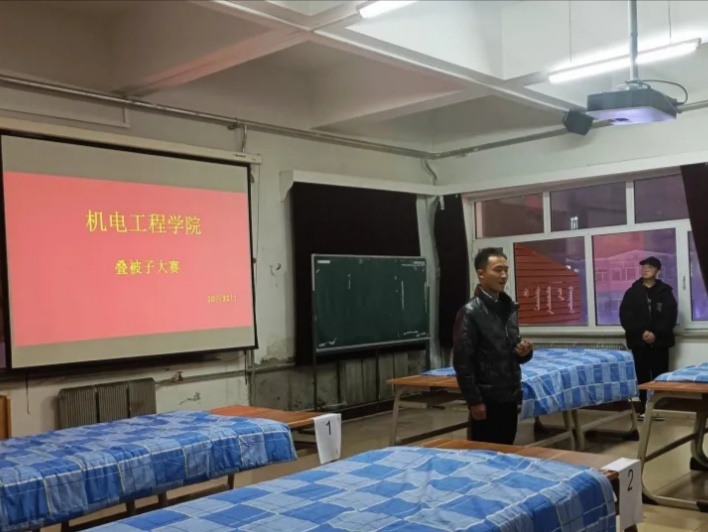 为了进一步提高老员工文明素质,加强精神文明建设。有效督促,激励同学们营造良好的生活环境,养成良好的生活习惯和提高宿舍内务整理能力,巩固军训成果。机电工程公司于2020年10月31日在知行楼520教室举行员工叠被子大赛。