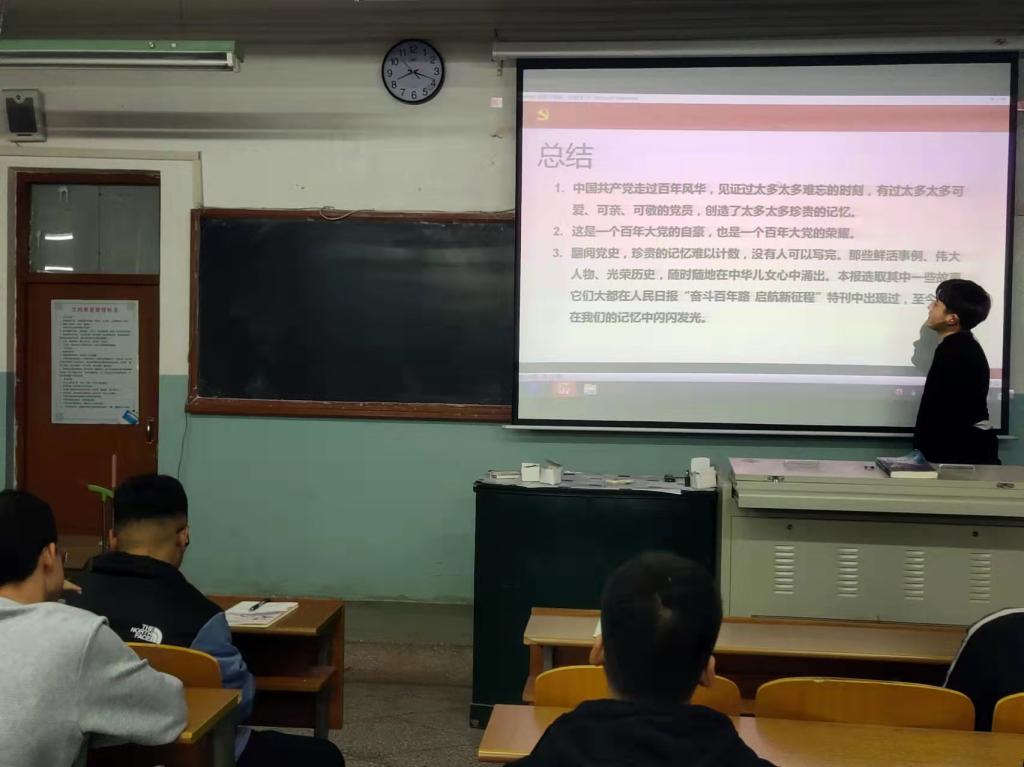 茫茫九脉流中国,纵横当有凌云笔。刘迈同学分享了对党的感悟:“峥嵘岁月犹当下,百年初心仍青年。青史如镜,鉴照峥嵘岁月,初心如炬,辉映复兴之路,用党的奋斗历程和伟大成就鼓舞斗志,明确方向,用党的光荣传统和优良作风坚定信念,凝聚力量,用党的实践创造和历史经验启迪智慧,砥砺品质。”