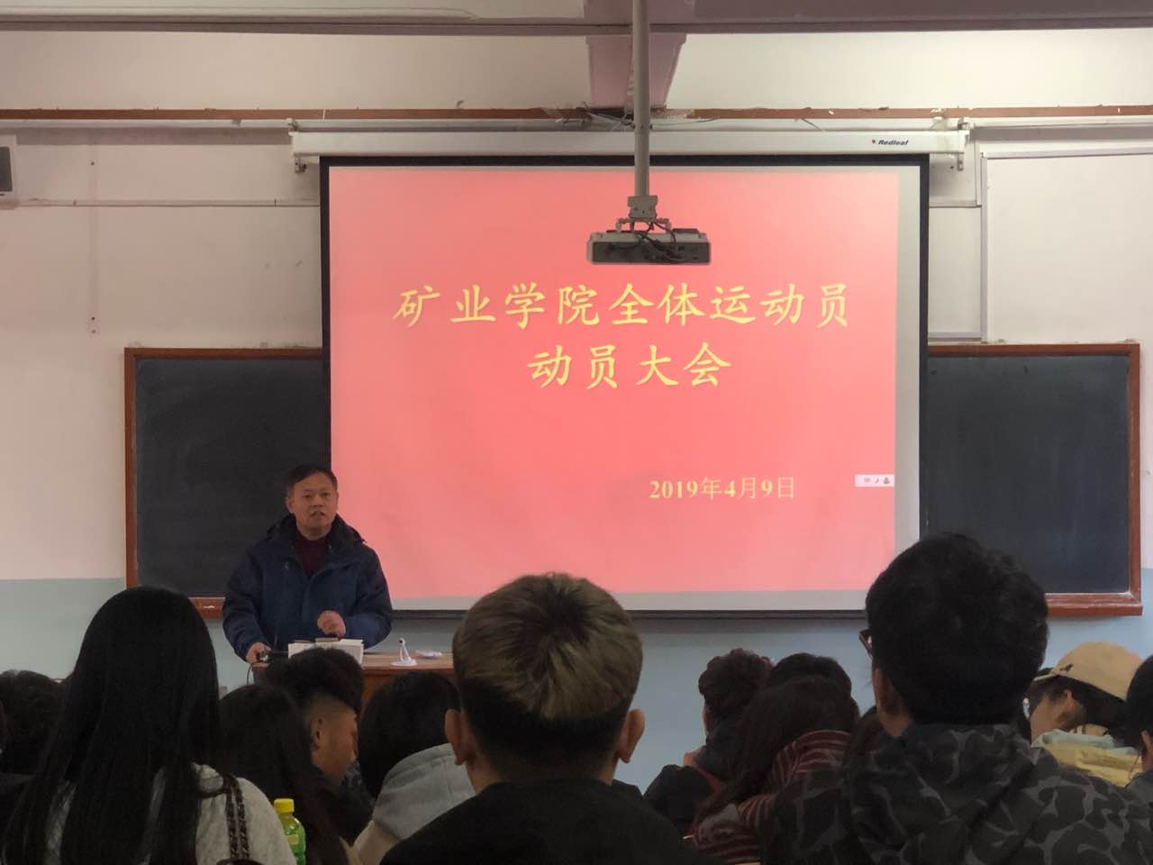 为充分调动矿业公司运动员的积极性,鼓舞选手们的参赛热情。2019年4月9日中午12:10在知行楼110举行了运动员动员大会,参加本次大会的有党总支副书记王旭,团总支书记汪鑫以及全体运动员、员工会成员。王旭副书记做了动员讲话。