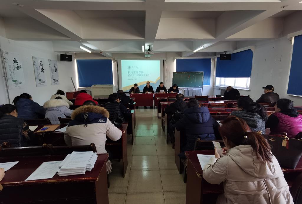 2020年12月17日上午,在知行楼422教室,机电工程公司组织了全体教职工进行民族工作知识学习。会议由党总支书记王旭主持。