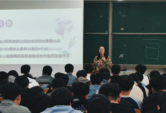 谢春辉副处长作为内蒙古自治区高校心理健康志愿热线服务队副队长、国家二级心理咨询师、高级家庭教育指导师,拥有丰富的心理专业知识。她首先强调了培育健康心理的重要性,并从保持乐观稳定的情绪、培养多种兴趣、自我调节和适应环境三个方面进行了深入阐述。